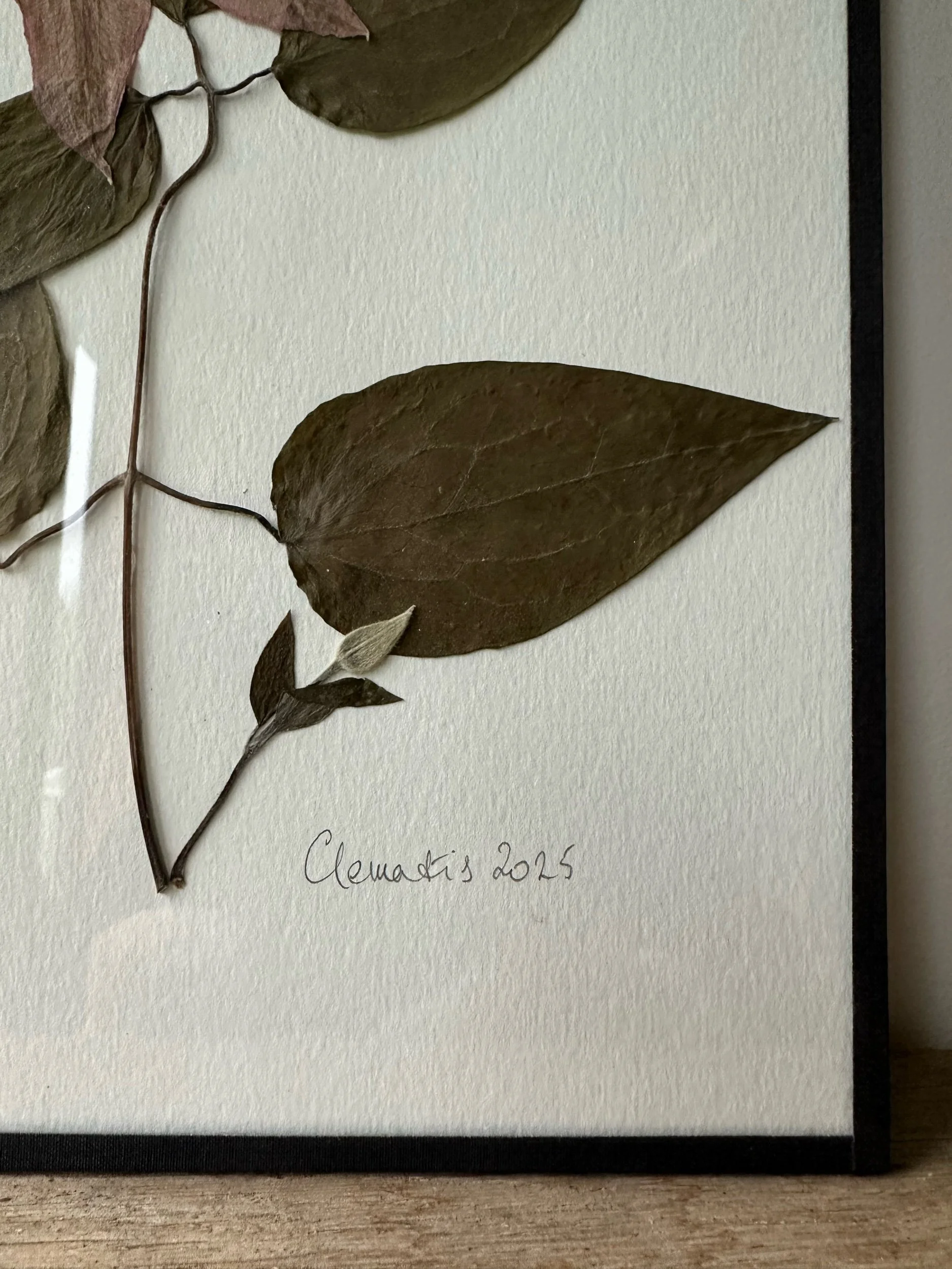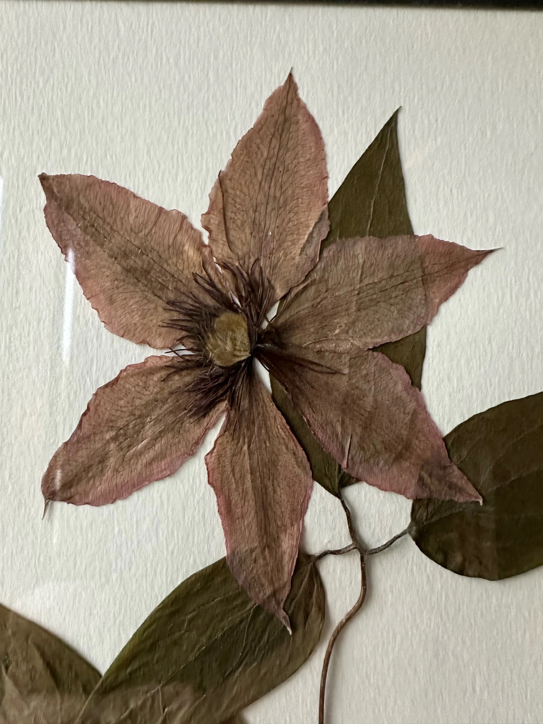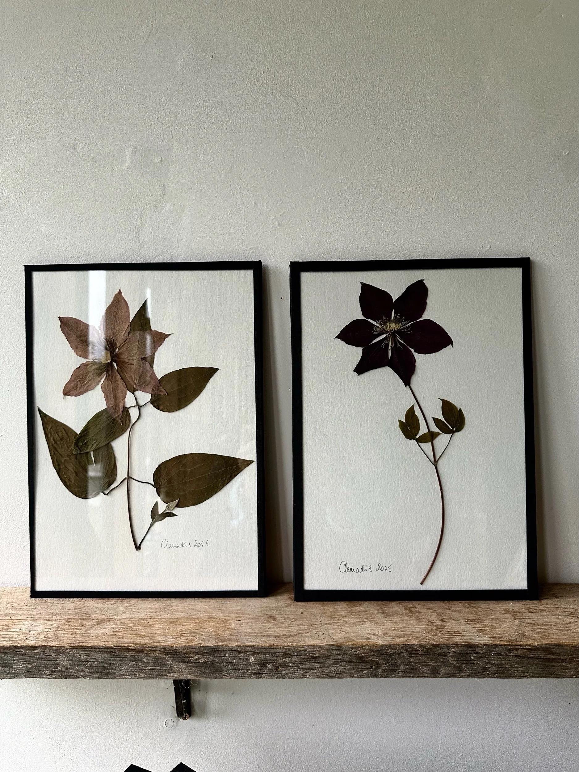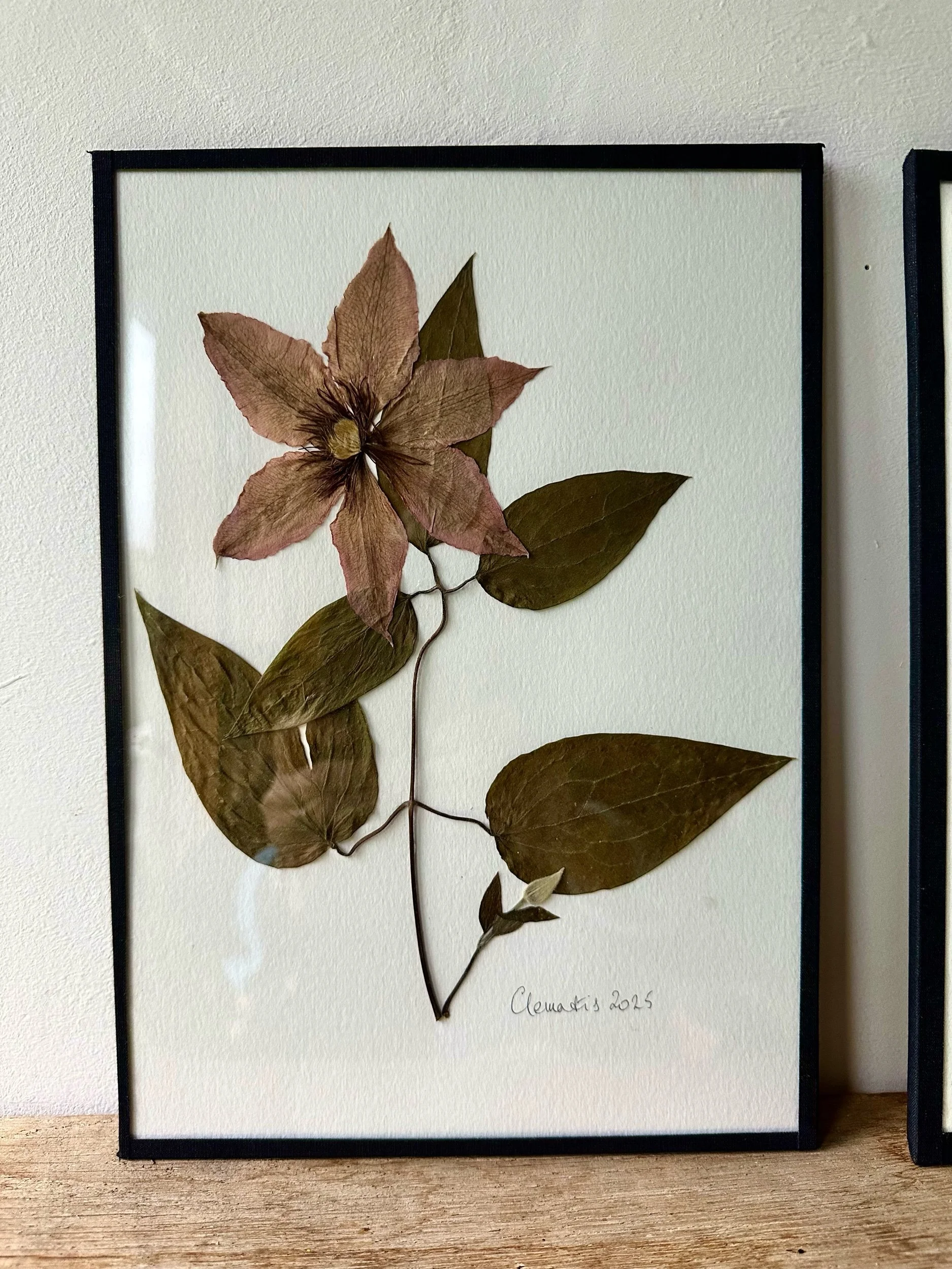 Shop › Pressed Flower Pink Clematis Image 1 of 5 Image 2 of 5 Image 3 of 5 Image 4 of 5 Image 5 of 5 Pressed Flower Pink Clematis £58.00 Sold Pink clematis pressed in 2025Frames using black linen tape 21 x 30cmPicture hook on back Sold Added! Pink clematis pressed in 2025Frames using black linen tape 21 x 30cmPicture hook on back