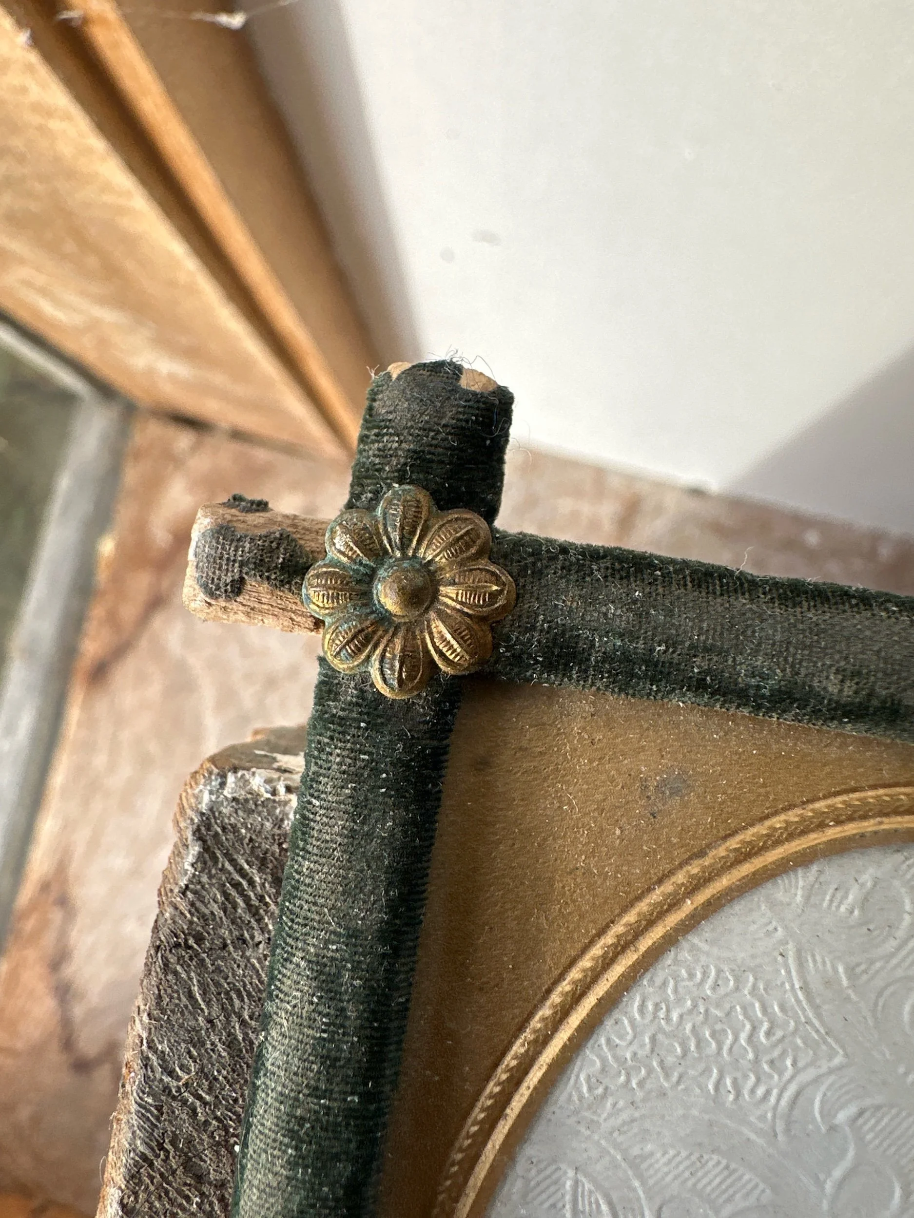 Beautifully made green velvet (well worn) frame with lovely gilt flowers at the corners and gilt stars on the frame. Gold oval birder with pretty backing