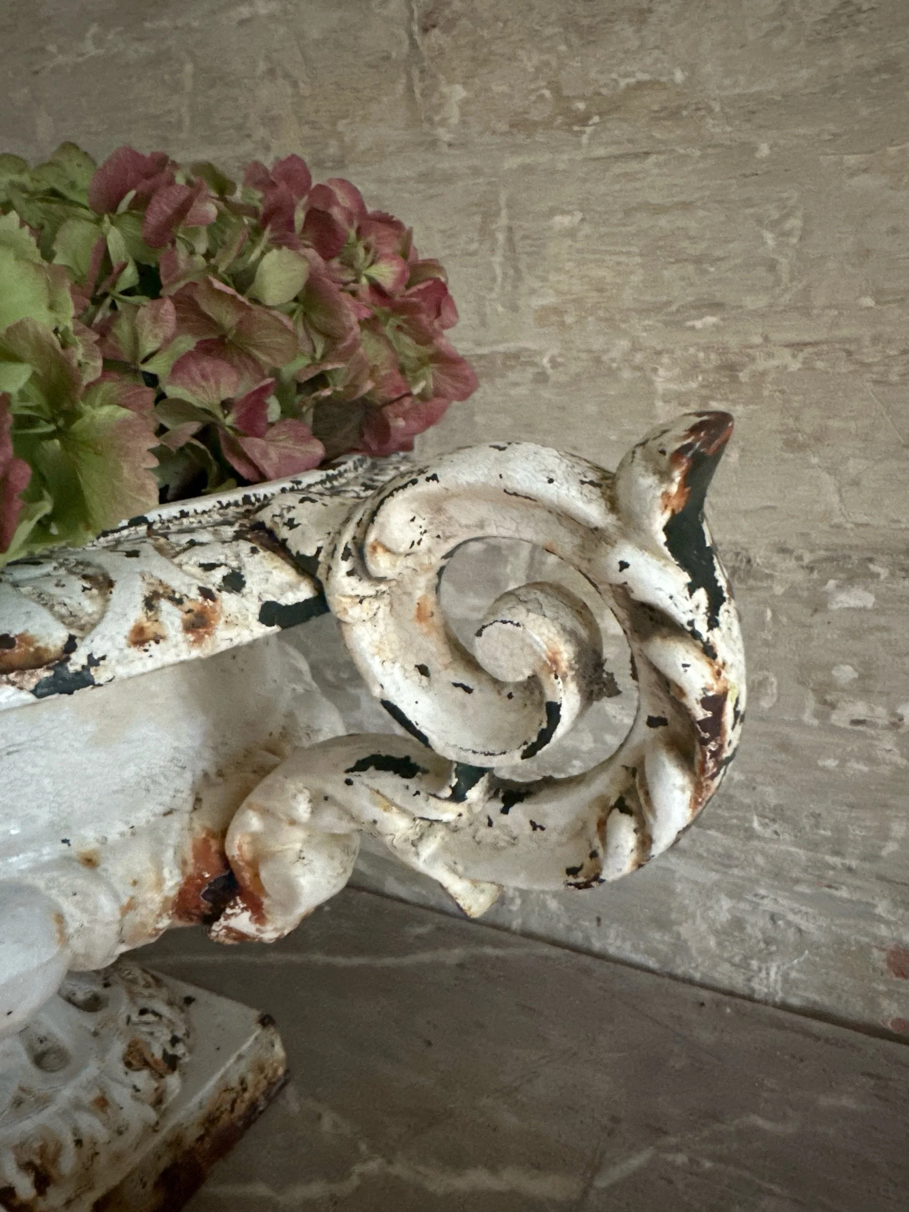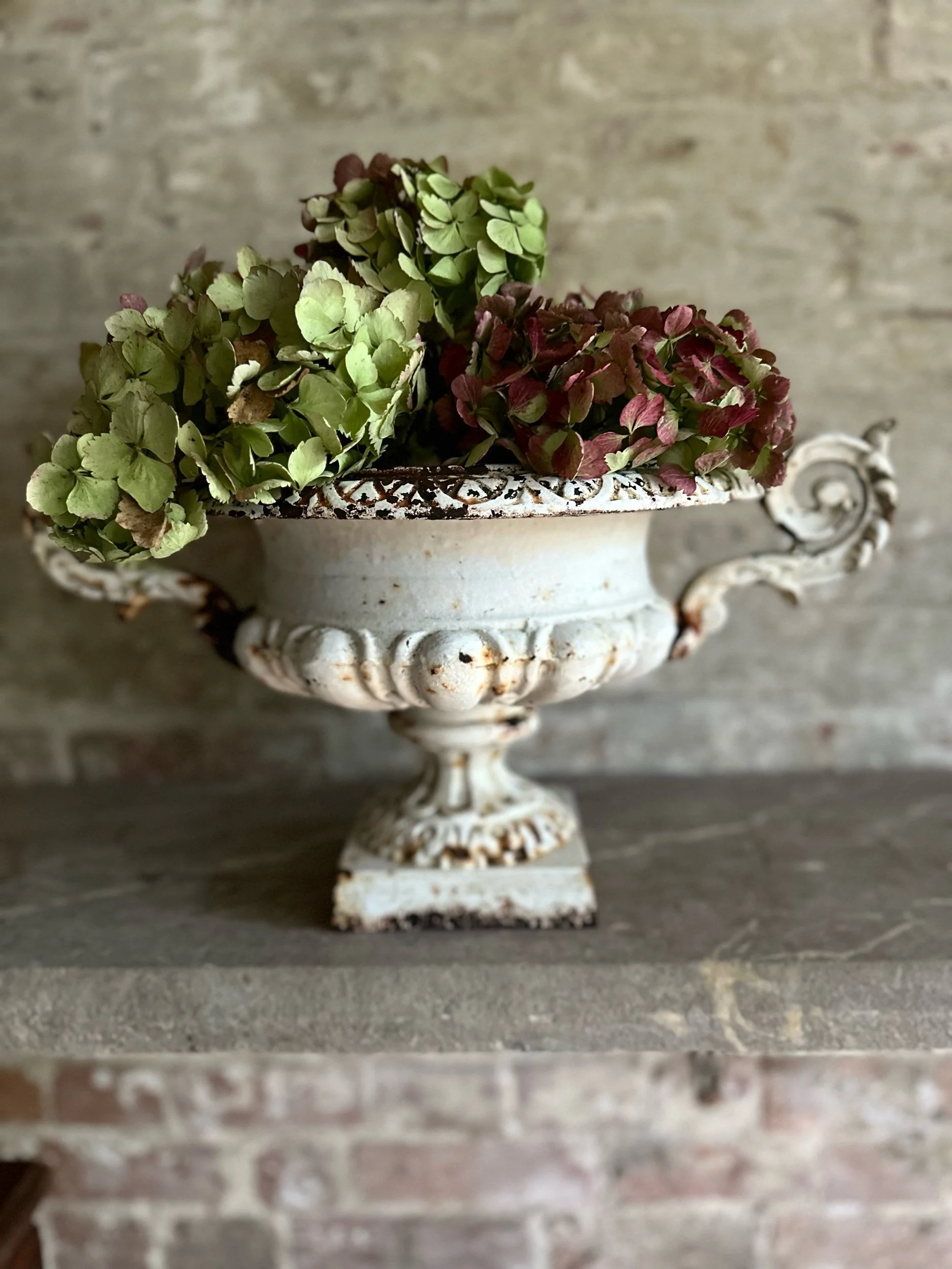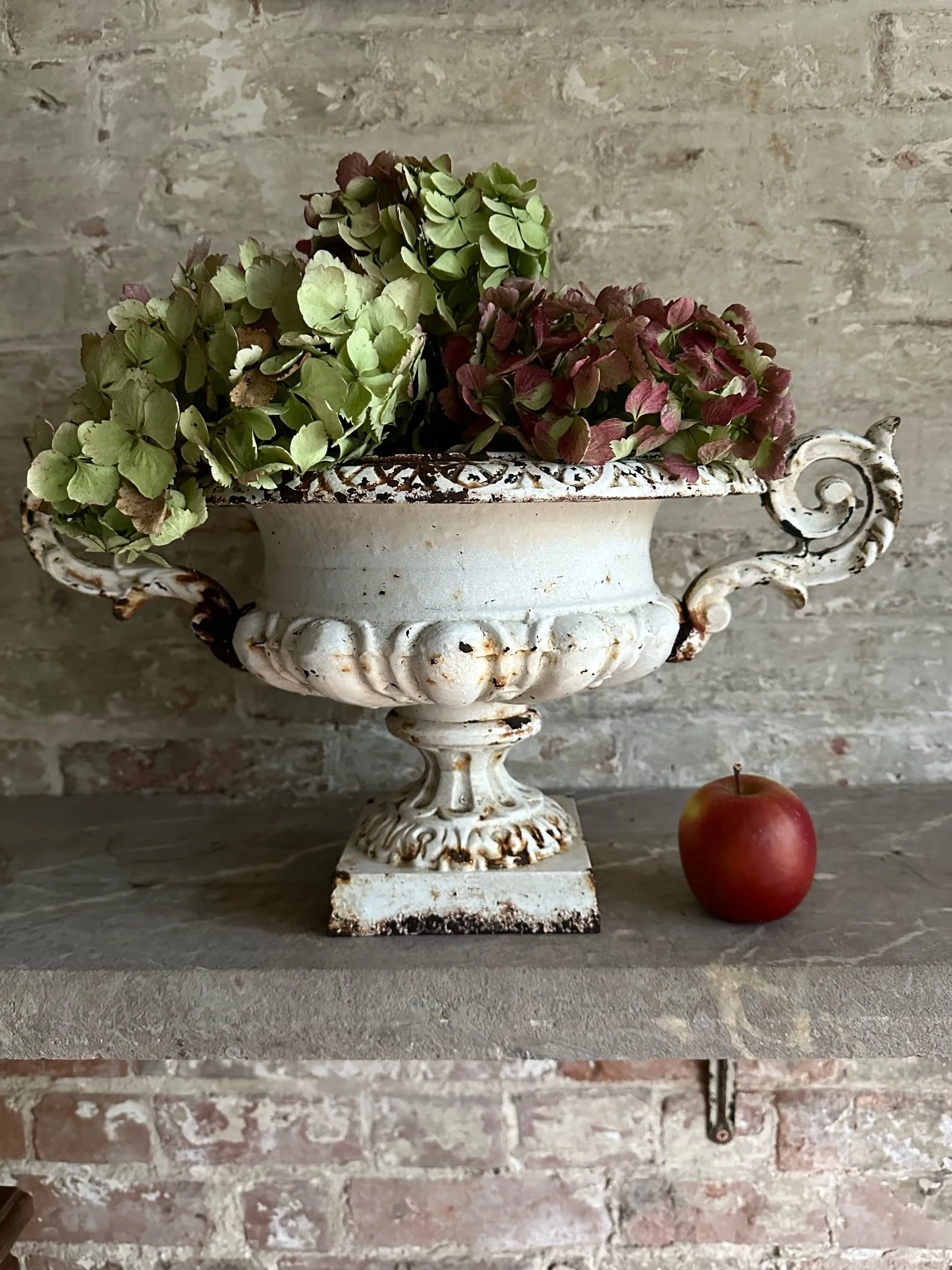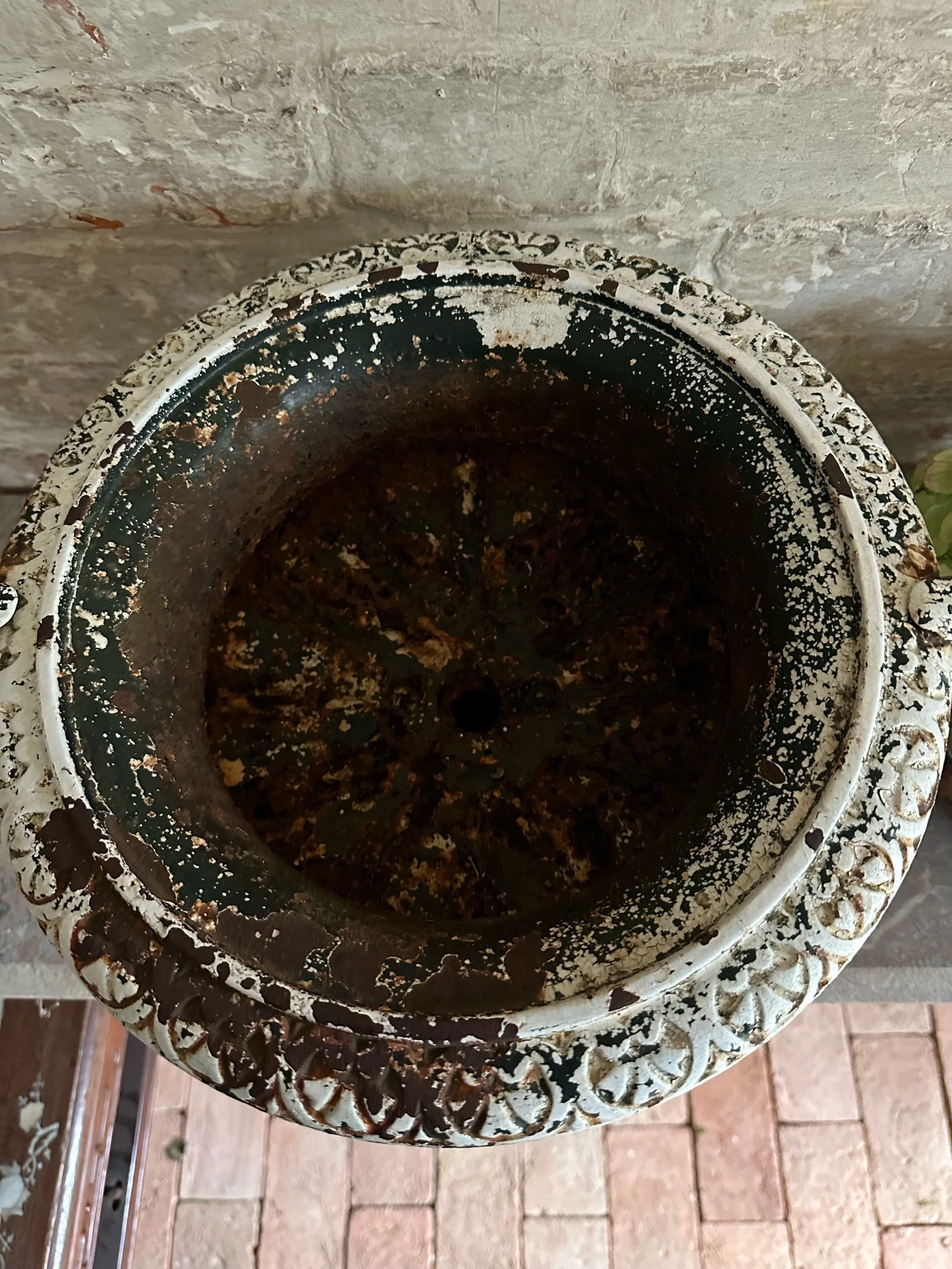 Shop › Cast Iron Painted Urn Image 1 of 4 Image 2 of 4 Image 3 of 4 Image 4 of 4 Cast Iron Painted Urn £165.00 Delightfully chippy and weathered cast iron urn Open to the bottom Width 48cm Height to top of handles 25cm Add To Cart Added! Delightfully chippy and weathered cast iron urn Open to the bottom Width 48cm Height to top of handles 25cm