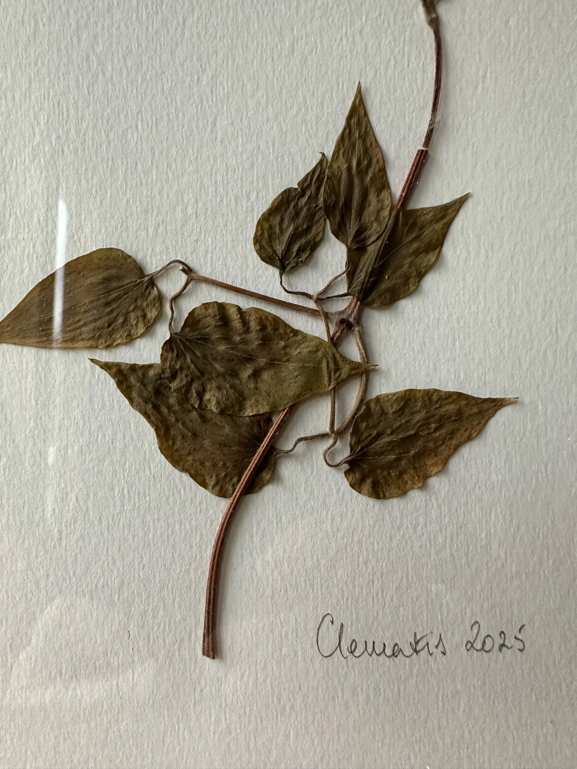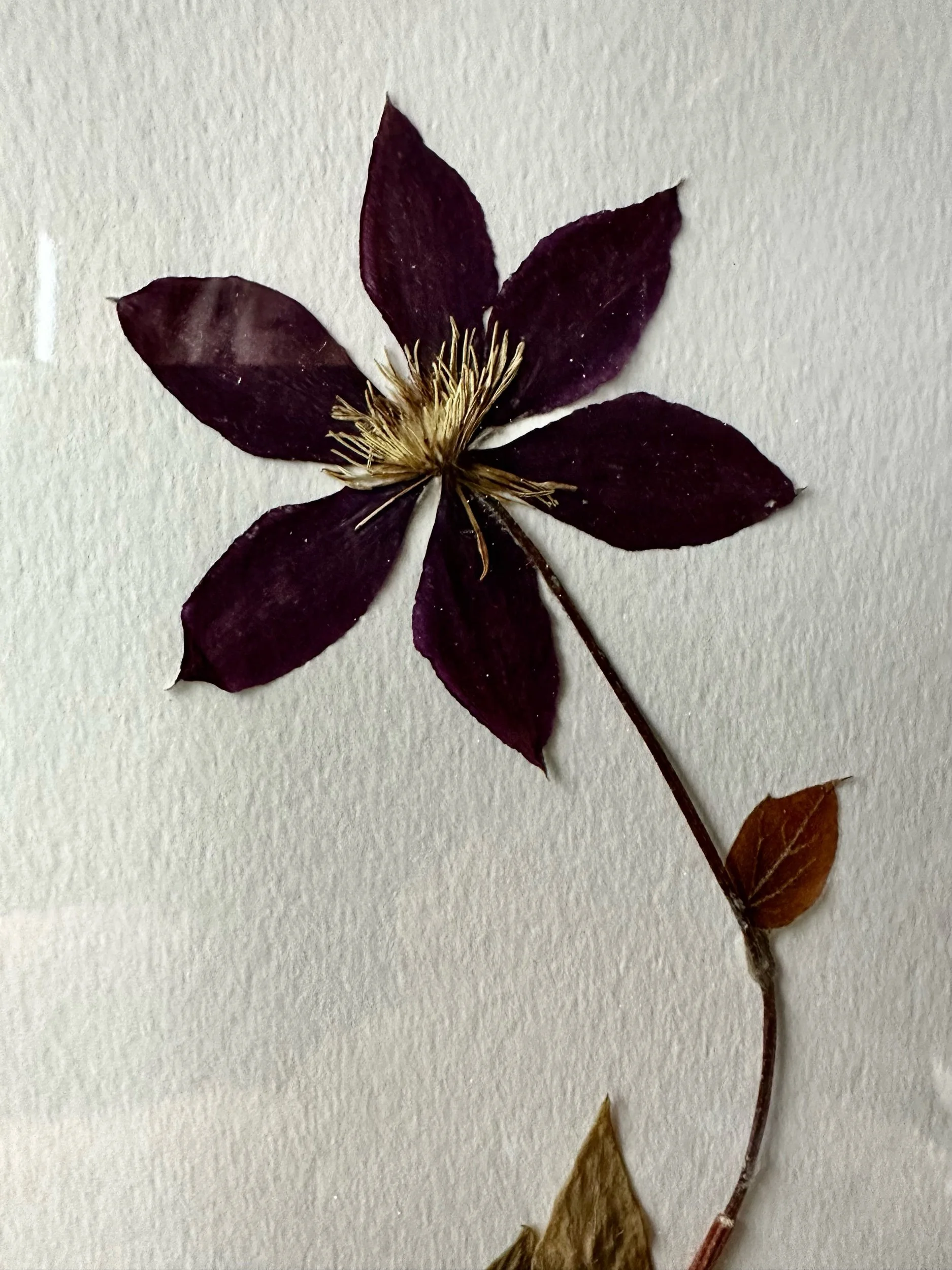 Shop › Pressed Small Clematis Image 1 of 5 Image 2 of 5 Image 3 of 5 Image 4 of 5 Image 5 of 5 Pressed Small Clematis £58.00 Pressed clematis, purple and small headedFramed using black linen tape30 x 21cm Add To Cart Added! Pressed clematis, purple and small headedFramed using black linen tape30 x 21cm