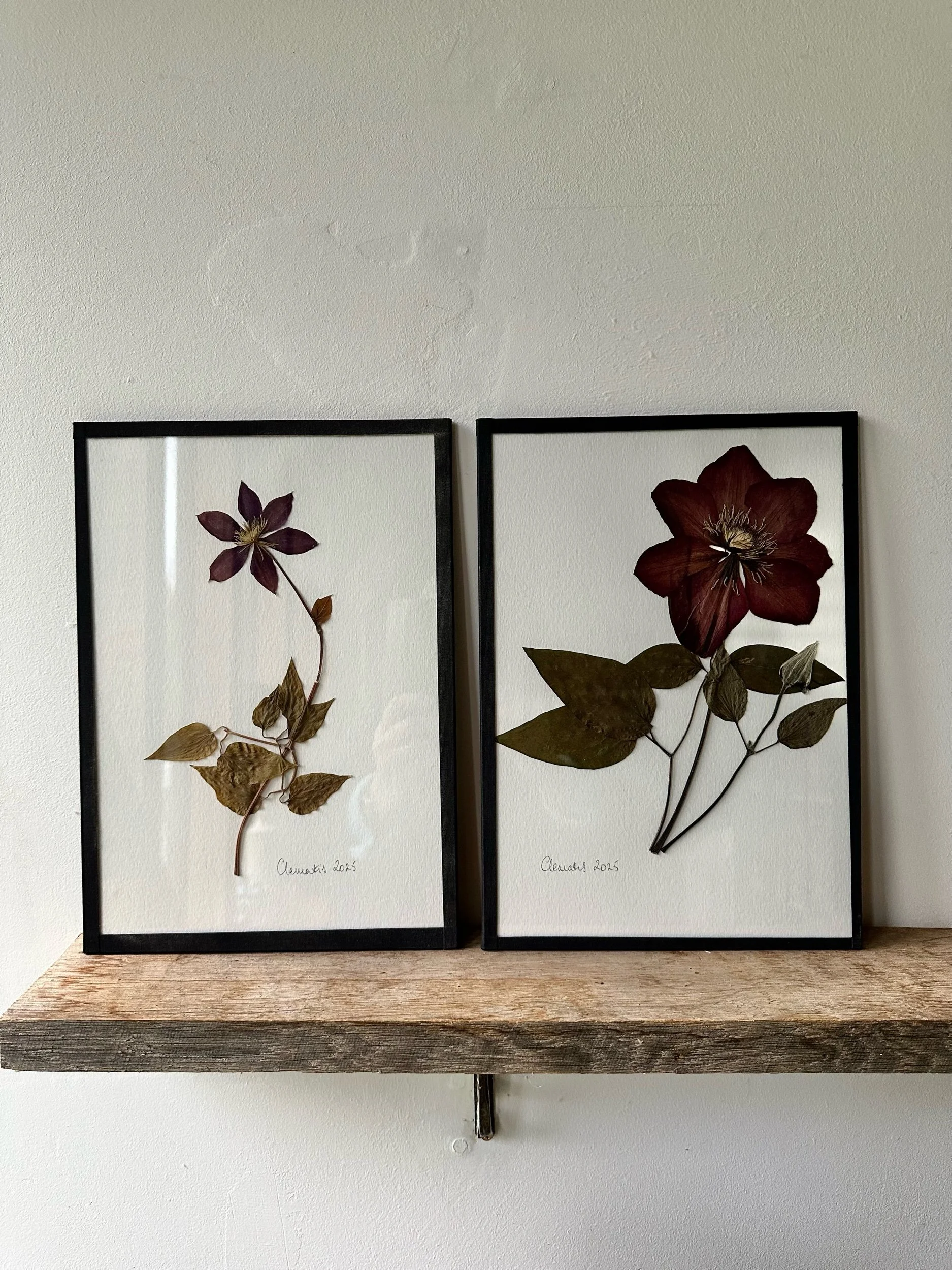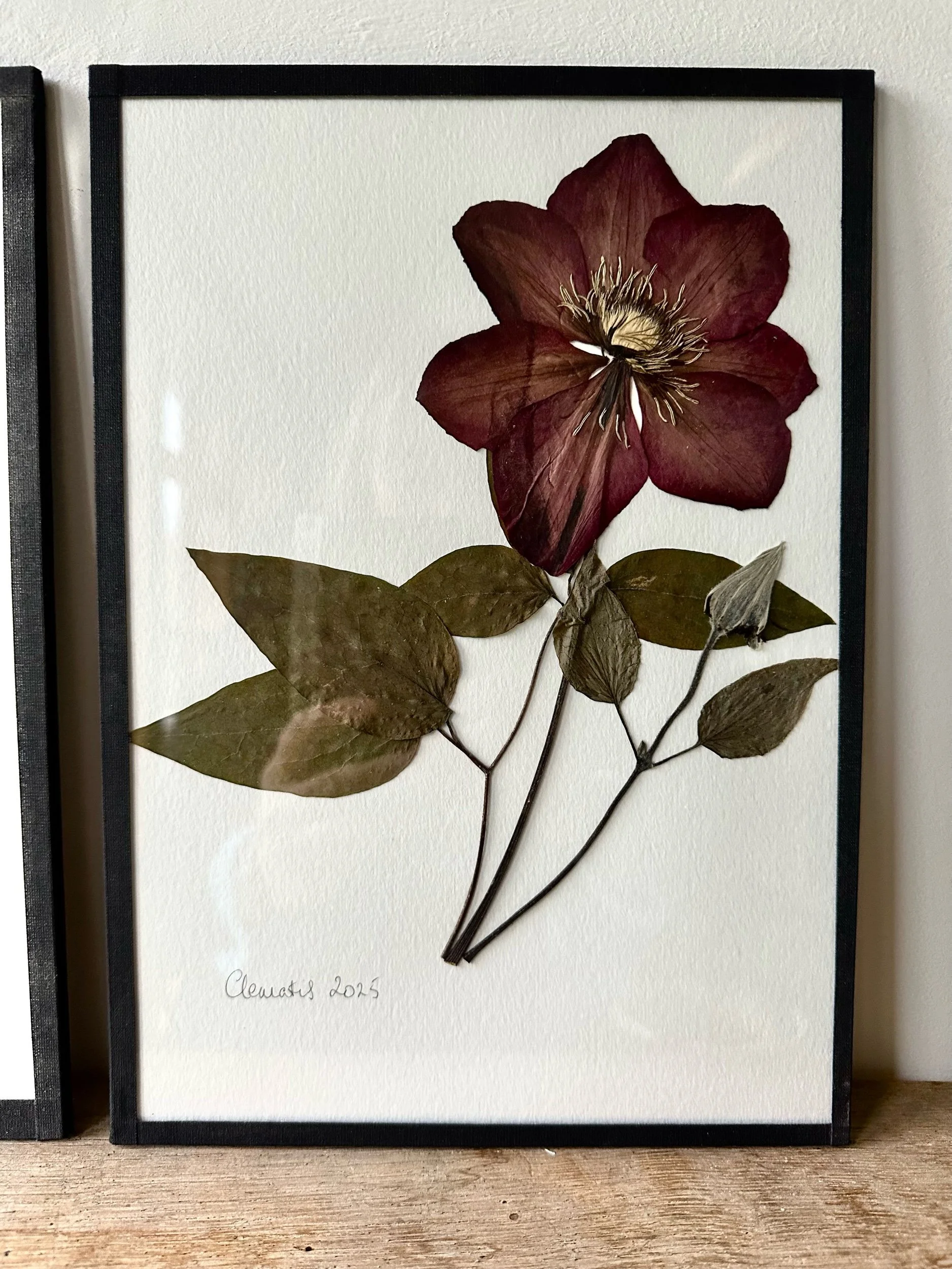 Shop › Pressed Mauve Clematis Image 1 of 4 Image 2 of 4 Image 3 of 4 Image 4 of 4 Pressed Mauve Clematis £58.00 Pressed mauve clematis in 2025Frames using black linen tape 21 x 30cm Add To Cart Added! Pressed mauve clematis in 2025Frames using black linen tape 21 x 30cm