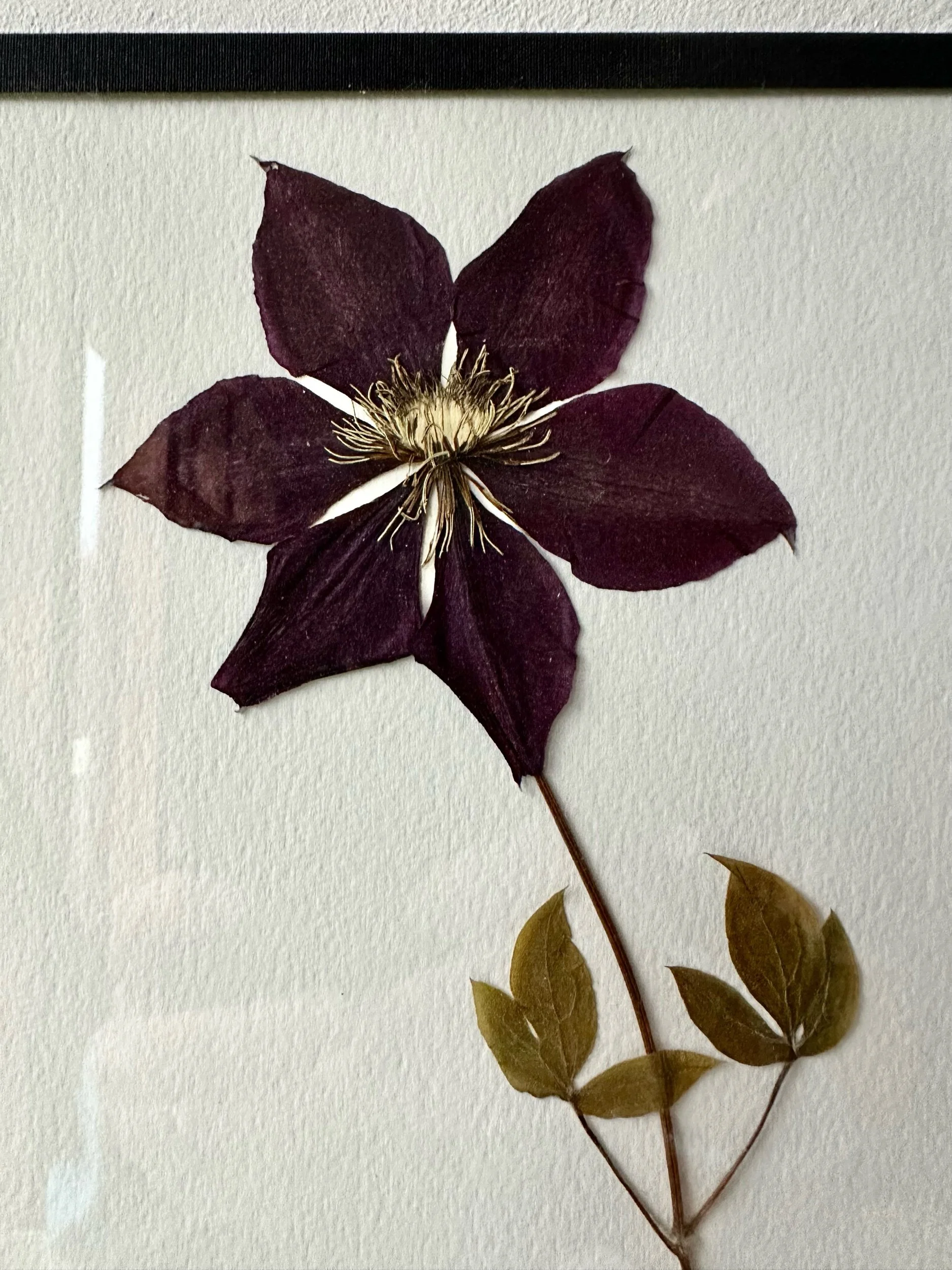 Shop › Pressed Flower Purple Clematis Image 1 of 5 Image 2 of 5 Image 3 of 5 Image 4 of 5 Image 5 of 5 Pressed Flower Purple Clematis £58.00 Pressed purple clematis in 2025Framed with black linen tape and a picture hook on the back2- x 30cm Add To Cart Added! Pressed purple clematis in 2025Framed with black linen tape and a picture hook on the back2- x 30cm